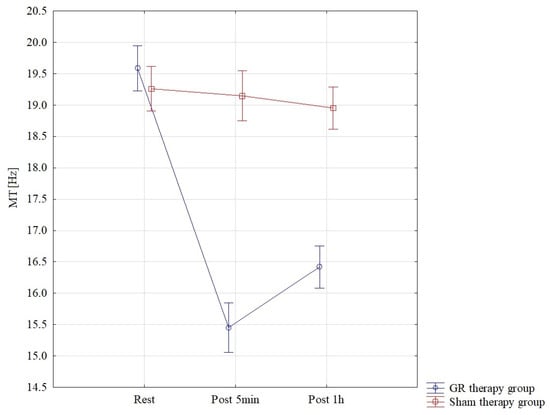 The results of the analysis of variance for MT (muscle tension) allowed for the finding of significant differences for the pre–post*therapy interaction F = 94.57; p < 0.001; η2 = 0.77. Significant differences were found between all interactions p < 0.001 in the GR therapy group. The lowest MT results were found in the GR therapy group, measured 5 min after therapy, M = 15.45 ± 0.93, and they were statistically significantly lower than those in the sham therapy group in the 5th minute of therapy, M = 19.15 ± 0.51. In the GR group, MT one hour after treatment M = 16.42 ± 0.71 was statistically significantly lower than that in the sham therapy group M = 18.95 ± 0.55 p < 0.001. These results are also confirmed by Figure 5.