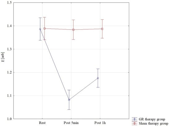 The results of the analysis of variance for E (elasticity) allowed for the finding of significant differences for the pre–post*therapy interaction F = 77.88; p < 0.001; η2 = 0.74. Significant differences were found in the GR therapy group between all interactions, p < 0.001. The lowest E scores were found in the GR therapy group measured 5 min after therapy, M = 1.08 ± 0.05, and they were statistically significantly lower than those in the sham therapy group 5 min after treatment, M = 1.38 ± 0.09. In the GR group, E therapy one hour after treatment M = 1.18 ± 0.05 was statistically significantly lower than that in the sham therapy group M = 1.39 ± 0.09 p < 0.001. These results are also confirmed by Figure 7.