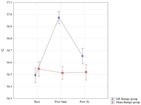 The results of the analysis of variance for °C (tissue temperature) allowed for the finding of significant differences for the pre–post*therapy interaction F = 45.83; p < 0.001; η2 = 0.62. Significant differences were found between all interactions p < 0.001 in the GR therapy group. The highest °C results were found in the GR therapy group measured 5 min after therapy, M = 36.97 ± 0.11, and they were statistically significantly higher than those in the sham therapy group 5 min after treatment, M = 36.51 ± 0.08. In the GR group, °C therapy, one hour after treatment, M = 36.65 ± 0.14, was statistically significantly higher than that in the sham therapy group, M = 36.52 ± 0.10 p = 0.024. These results are also confirmed by Figure 8.