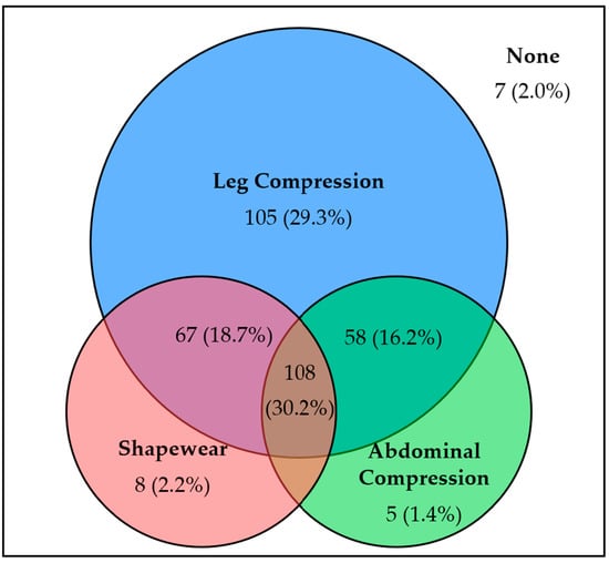 Three hundred and fifty-one (98.0%) participants reported trying at least one compression garment since their diagnosis. Among the 118 (33.0%) participants who only used one form of compression garment, leg compression was the most common (Figure 2). Sixty-seven (18.7%) participants used shapewear and leg compression. Fifty-eight (16.2%) participants used abdominal compression and leg compression. One hundred and eight (30.2%) participants used all three forms of compression garments.