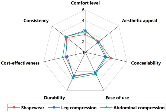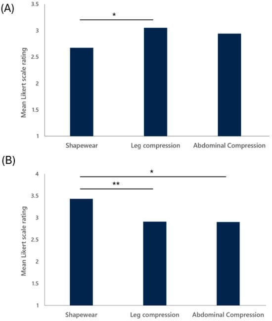 Participants rated abdominal compression garments to be significantly more cost-effective than shapewear and leg compression garments (mean 3.15 vs. 2.90 vs. 2.73, respectively; p = 0.028) (Appendix A). Cost-effectiveness ratings in this study were subjective measures influenced by individual value judgments of a product’s worth, considering both its cost and perceived health benefits. All three forms of compression garments were rated to have comparable levels of aesthetic appeal, ease of use, durability, and consistency (Table A1).