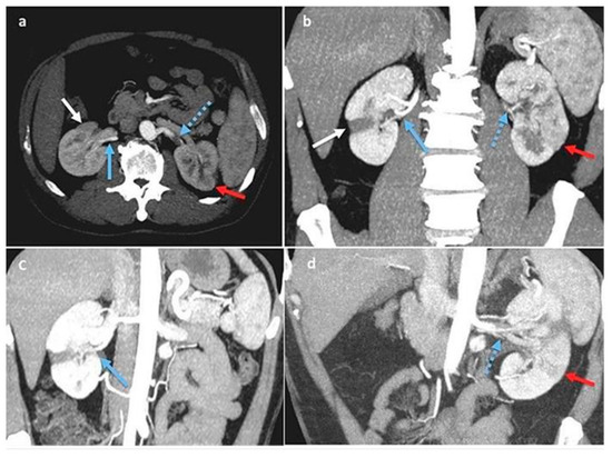 (a–d): Multiplanar reconstructions on Anglo-CT scan, arterial phase. Right kidney: focal ischemic area (white arrow) associated with sub-acute dissection of the inferior polar artery (blue arrow). Left kidney: acute dissection of renal artery (blue arrow with dots) with focal acute ischemic area (red arrow).