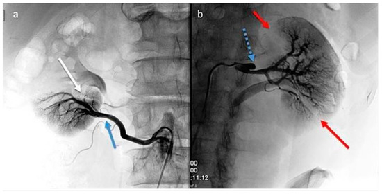 (a,b): Digital subtraction angiography (DSA). Right kidney (a): segmental renal artery occlusion (white arrow) consequent to distal dissection (blue arrows) of the inferior polar artery originating from the abdominal aorta. Left kidney (b): renal artery dissection (blue arrow with dots) with occlusion of smaller superior and inferior segmental branches and their corresponding focal de-vascularized areas (red arrows).