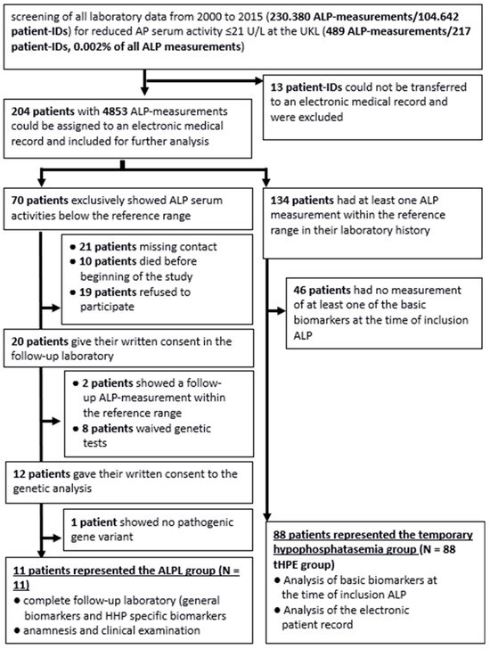 All ALP serum activity levels available at the UHL were analyzed. The reference range was 35–105 U/L for healthy women and 40–130 U/L for healthy men [19,20]. A total of 204 patients with at least one measured ALP serum activity levels < 21 U/L were selected [18]. In cases of multiple ALP serum activity levels, the lowest was used as the inclusion value. After analysis of their medical history, 134 (66%) of the 204 patients had physiological ALP serum activity levels as defined by tHPE. Of these, 46 had no measurement of other common biomarkers and were therefore excluded. In 88 of them, at least one of the general biomarkers was measured simultaneously. They were included in the temporary hypophosphatasemia group (n = 88, tHPE group).