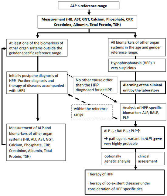 First, in patients where a decreased ALP serum activity level has been identified alongside other general parameters within the reference range, a specific HPP diagnosis can be recommended. Second, in patients with one or more general parameters in the pathological range in addition to decreased ALP serum activity level, further investigation of the treatable differential diagnoses (Table 1) is strongly recommended. Following the targeted treatment of the differential diagnoses, a remeasurement of the biomarkers is recommended. In the event that the general biomarkers normalize concurrently with persistently decreased ALP serum activity levels, a PNV of the ALPL gene remains a probable explanation. In both situations, it is recommended that an extended HPP-specific diagnostic work-up be performed, including BALP and PLP levels [33]. A diagnosis of HPP can be made in the presence of additional clinical symptoms that are characteristic of HPP. In rare cases, a PNV of the ALPL gene can coexist with pathological values of the general biomarkers presented. In such cases, according to the literature, genetic analysis is recommended. However, if the patient presents with clinical and laboratory findings consistent with a diagnosis of HPP, it is not recommended that genetic analysis be conducted as a routine procedure [5,34,35].
