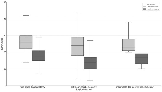 For eyes treated with 360-degree trabeculotomy, the mean IOP at the time of surgery was 23.27 ± 7.71 mmHg. At the final follow-up, the IOP had decreased to 12.89 ± 4.50 mmHg, with a mean reduction of 10.38 ± 7.38 mmHg (p < 0.001). In the rigid probe trabeculotomy group, the mean pre-operative IOP was 26.34 ± 7.75 mmHg, which decreased to 16.98 ± 4.71 mmHg at the final follow-up, resulting in a mean IOP reduction of 9.36 ± 8.53 mmHg (p < 0.001).