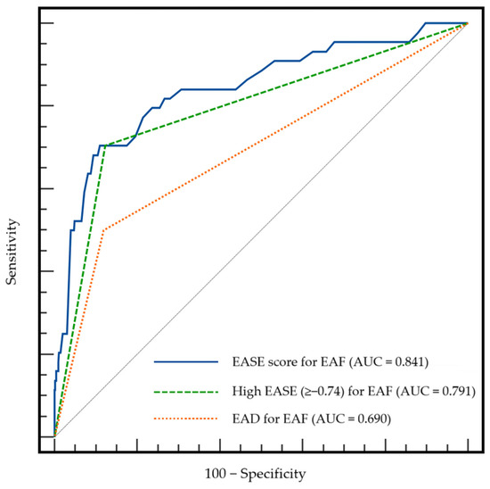 We compared the AUCs for EAF among the EASE score, a high EASE score, and EAD (0.841, 0.791, and 0.690, respectively; Figure 1). According to Delong’s method, both the EASE score and a high EASE score showed a significantly better predictive ability than did the EAD (p < 0.001 and 0.018, respectively).