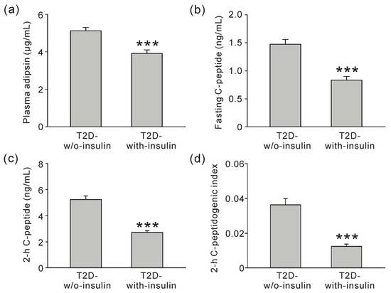 Plasma adipsin concentration varies with pancreatic beta cell function in the diabetic groups. Plasma adipsin concentrations (a) and fasting serum C-peptide concentrations (b) in the T2D-w/o-insulin (n = 71) and the T2D-with-insulin (n = 64) groups. 2-h C-peptide concentrations (c) or 2-h C-pepditogenic index (d) during oral glucose tolerance test in the T2D-w/o-insulin and T2D-with-insulin groups. Data represents the mean ± standard error of the mean. *** p < 0.001 vs. T2D-w/o-insulin group. T2D, type 2 diabetes; T2D-w/o-insulin, T2D without insulin treatment; T2D-with-insulin, T2D with insulin treatment.