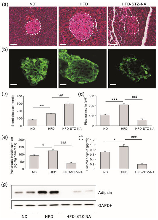 To explore the relationship between adipsin expression and pancreatic beta cell function in animal models comparable to the study group, we utilized ND, HFD, and HFD-STZ-NA mice. Although animal models of T2D are fundamentally different from the human condition, we used the HFD-STZ-NA mouse model to mimic the T2D-with-insulin group [21]. The HFD mice exhibited an increase in pancreatic beta cell mass compared to the ND mice, whereas the insulin-deficient T2D model, HFD-STZ-NA, showed a reduction in beta cell mass compared to the HFD mice (Figure 2a,b). After a 10 h fast, blood glucose levels were significantly higher in the HFD mice compared to the ND mice and further elevated in the HFD-STZ-NA mice compared to HFD (Figure 2c). As expected, plasma insulin concentration, pancreatic insulin content, and plasma adipsin levels were significantly higher in the HFD mice compared to the ND mice and significantly lower in the HFD-STZ-NA mice compared to the HFD mice (Figure 2d–f). Similarly, adipsin expression in WAT followed the same pattern, with a notable increase in the HFD mice compared to the ND mice and a significant decrease in the HFD-STZ-NA mice compared to the HFD mice (Figure 2g). These findings suggest that changes in adipsin expression in WAT correspond to changes in beta cell mass and function in T2D.