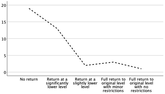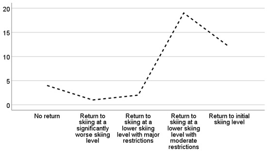 Regarding their return to alpine skiing, 19 (50%) patients stated that they did not expect to be able to ski again, 13 (34.2%) stated that they would be able to ski again at a significantly lower level, 2 (5.3%) patients expected a return to skiing at a slightly lower level, and 4 (10.5%) patients expected that skiing would be possible again at the original level with minor restrictions at most (Figure 1).