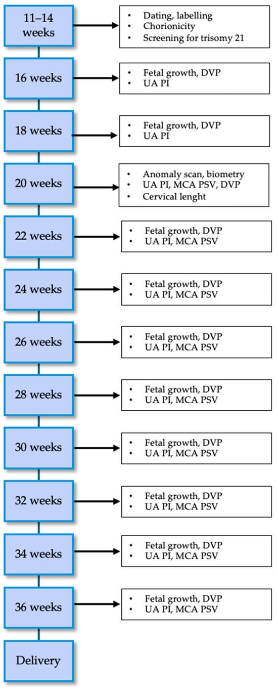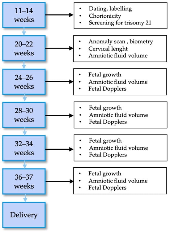 - Corcoran, S.; Breathnach, F.; Burke, G.; McAuliffe, F.; Geary, M.; Daly, S.; Higgins, J.; Hunter, A.; Morrison, J.J.; Higgins, S.; et al. Dichorionic twin ultrasound surveillance: Sonography every 4 weeks significantly underperforms sonography every 2 weeks: Results of the Prospective Multicenter ESPRiT Study. Am. J. Obstet. Gynecol. 2015, 213, 551.e1–551.e5. [Google Scholar] [CrossRef]