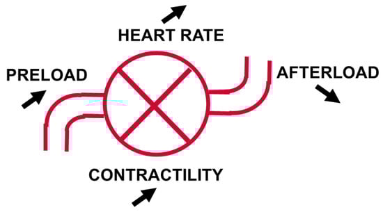 Considering the four determinants of cardiac output (preload, afterload, cardiac contractility, and heart rate) (Figure 2), if the doses of vasopressors cannot be decreased, increasing the heart rate is generally not a good option, and many of these patients already have tachycardia, so the two remaining options to improve cardiac output are to increase the preload and/or the contractility. For this purpose, the administration of intravenous fluids should be considered first, with a fluid challenge technique using small aliquots of about 200 mL of fluids [52]. If the filling pressures increase excessively, or if the tissue perfusion does not improve, the administration of an inotropic agent is necessary. A low central venous oxygen saturation (ScvO2) can represent a valuable tool to identify an inadequate DO2 [53]. Dobutamine is the most used and most reliable agent in this context, and low doses are usually sufficient. Interestingly, a recent meta-analysis suggested that the combination of norepinephrine plus dobutamine was associated with a lower risk of 28-day mortality than other vasoactive medications in patients with septic shock [7].