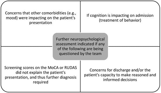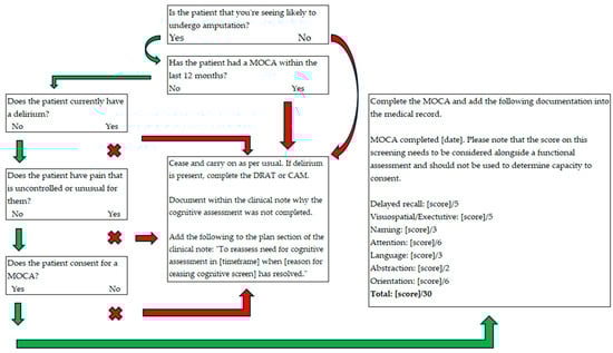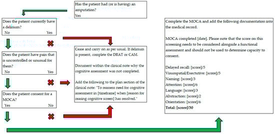The codesign participants determined that, ideally, the screening tool would be completed on two occasions, the first prior to hospital admission via the high-risk foot clinic and podiatry and the second on admission to rehabilitation or transfer from an acute hospital ward, as this would capture the most patients, giving clinicians the best chance of having a baseline cognitive score available for comparison. There were three contraindicators for completing the cognitive screening that the codesign group established: a non-consenting patient, acute delirium, and acute or changed pain reporting. Delirium could be confirmed using the Confusion Assessment Method (CAM) [