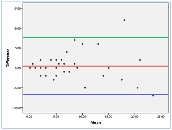 The analysis of the test–retest reliability of the ICIQ-FLUTS questionnaire revealed a high level of stability for the total scores of urinary incontinence over the two-week period. The assessment of test–retest reliability involved the computation of the intraclass correlation coefficient of all questions (ICC = 0.921). As presented in Table 3, the test–retest values were examined for the complete questionnaire, as well as for each individual item and the subscales. Figure 1 illustrates the Bland–Altman plot for the test–retest reliability of the ICIQ-FLUTS.