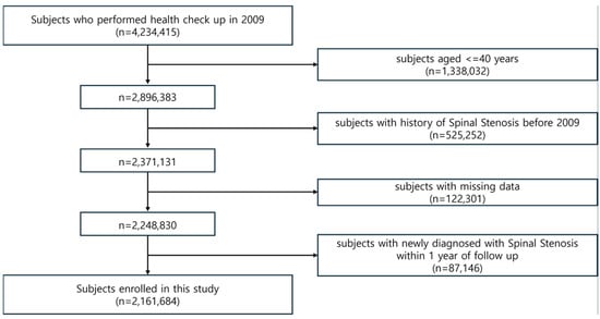 The NHIS claims dataset is structured based on the International Classification of Diseases, Tenth Revision (ICD-10), providing examination and treatment information suitable for population-based cohort studies [20]. This study focused on individuals aged 40 and older who underwent health checkups in 2009. Among the study population, patients with spinal stenosis were identified using the NHIS claims dataset, with the diagnosis based on the ICD-10 code M48.06, which specifically refers to lumbar spinal stenosis. The diagnosis of lumbar spinal stenosis in the Korean National Health Insurance System is primarily based on patient history, neurological examination, and imaging studies such as computed tomography (CT) and magnetic resonance imaging (MRI). Key symptoms include neurogenic claudication, sensory abnormalities, and motor deficits. These clinical findings are complemented by imaging-confirmed morphological or pathophysiological changes. All diagnostic codes are assigned by board-certified physicians following thorough clinical evaluations and imaging studies.