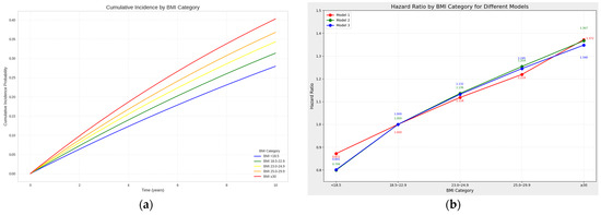 Analysis of spinal stenosis risk according to BMI categories. (a) Estimated cumulative incidence probabilities over a 10-year follow-up period, with each line representing a different BMI category. (b) Hazard ratios for spinal stenosis across BMI categories, with BMI 18.5–22.9 as reference (HR = 1.0) and error bars indicating 95% confidence intervals.