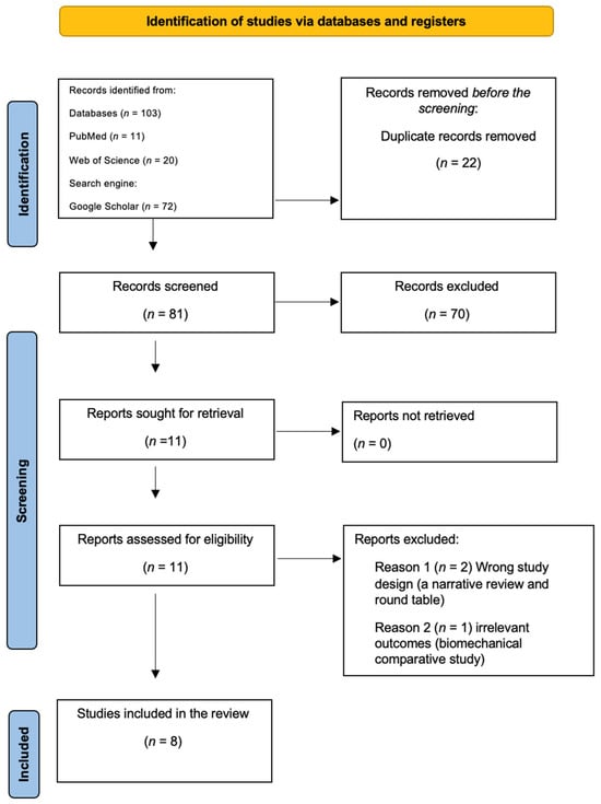 A flow diagram of the study selection process is presented in Figure 2, and a total of 103 studies were identified through database searches and search engines such as Web of Science, Google Scholar, and PubMed. The duplicated records that were removed were 22 articles before the screening. A total of 81 articles were subsequently screened by the title and the abstract. Eleven studies were reviewed in full text to assess the eligibility criteria, and three studies were excluded, as described in the PRISMA figure. A total of eight articles were included in this systematic review [25,26,27,28,29,36,37,38].