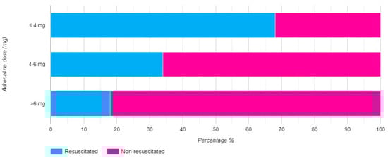 The impact of adrenaline dose on ROSC is highly controversial, making it difficult to attribute its influence directly due to the risk of resuscitation time-bias []. It is well established that prolonged resuscitation time negatively impacts the likelihood of ROSC [,]. Thus, distinguishing between the effects of adrenaline dosage and the influence of prolonged resuscitation time is challenging. Typically, 4 mg of adrenaline is administered over approximately 10–15 min within the non-shockable rhythm protocol and about 20 min within the shockable rhythm protocol []. Patients receiving adrenaline doses equivalent to this timeframe generally have a higher chance of resuscitation and ROSC (Figure 2). Studies on optimal resuscitation time regarding the initial rhythm suggest that 12 min is the optimal cut-off for successful resuscitation, which aligns with the interval in which 4 mg could be administered []. Another study indicated that administering more than 5 mg of adrenaline predicted unsuccessful prehospital resuscitation []. Our comparative results showed that patients receiving 4–6 mg and over 6 mg of adrenaline had lower success rates (Figure 1 and Figure 2).