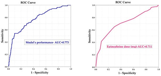 Receiver’s operating curve showing the accuracy of the multivariable model predictive probability and epinephrine does (mg) in determining the chance of a successful resuscitation.
