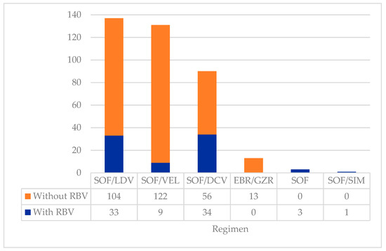 Types of DAA regimens prescribed to the cohort (n = 375). Abbreviations: DAA—direct-acting antiviral; DCV—daclatasvir; EBR—elbasvir; GZR—grazoprevir; LDV—ledipasvir; RBV—ribavirin; SIM—simeprevir; SOF—sofosbuvir; VEL—velpatasvir.