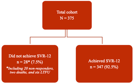 Flowchart depicting outcomes of DAA treatment in the cohort (n = 375). Abbreviations: SVR—sustained virologic response; SVR-12—SVR at 12 weeks post-treatment completion; LTFU—lost to follow-up.