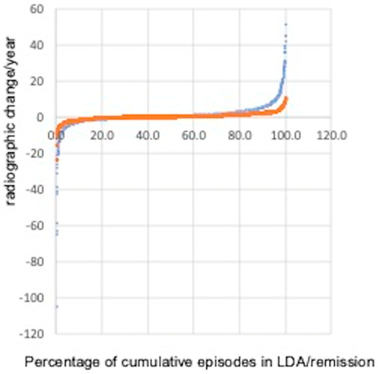 Radiographic-determined change/year within periods of LDA (blue) and remission (red) were analyzed separately for both patient groups. The groups were normalized to reflect progression observed between 2 sets of radiographs: 1447 patients in remission and 2614 patients in LDA.