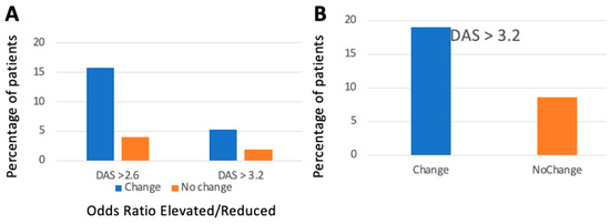 Frequency of radiographic progression: DAS 28 > 2.6 (left) and > 3.2 (right). (A) Remission, (B) LDA, Orange: No therapeutic regime change, Blue: Therapeutic regime change.