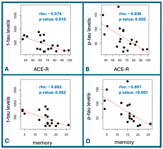 Correlations between the levels of CSF t-tau and p-tau and the total ACE-R scores and memory sub-scores among the CAA participants. Legend: Negative correlations are depicted between the CSF t-tau levels and ACE-R (A), p-tau levels and ACE-R (B), t-tau levels and memory sub-score (C), and p-tau levels and memory sub-score (D). The Spearman’s rank correlation test was used to determine significant correlations.