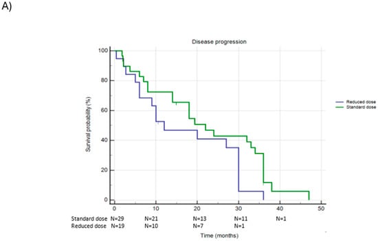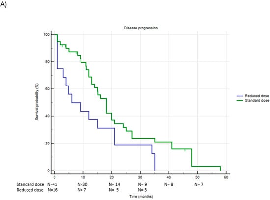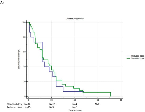 A total of 73 patients (46.2%) required temporary interruption of therapy due to grade 3–4 adverse events. Although more frequent in the standard-dose group, the difference in interruption rates was not statistically significant between the groups (50.9% in the standard-dose group vs. 36.0% in the reduced-dose group, p = 0.081). Permanent discontinuation of therapy occurred in 46 patients (29.1%) due to worsening of the performance status or patient’s refusal to continue the therapy in the absence of progression; there was no significant difference in frequency between the standard-dose group (28.7%) and the reduced-dose group (30.0%) (p = 0.868).