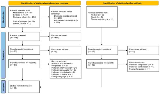 A flowchart outlining the study selection procedure is presented in Figure 1. A total of 1282 records were retrieved from electronic databases and registry searches, and 30 studies involving 5265 knee OA patients with pain were included in the systematic review. Of these, 28 articles were identified from electronic sources, while 2 were identified from other sources such as reference lists and forward citation searching. The screening process involved 746 records for titles and abstracts and 88 full-text articles for eligibility after removing duplicates.