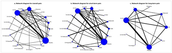 Network plot of studies included in network meta-analysis for overall pain (a), short-term pain (b), and long-term pain (c). The size of the nodes is proportional to the number of studies evaluating each intervention, and the thickness of the edges is proportional to the number of randomly assigned patients contributing to direct comparisons. G, glucosamine; CS, chondroitin sulfate; UC-II, undenatured type II collagen; D-002, an inhibitor of both cyclooxygenase and 5-lipoxygenase activities; MSM, methylsulfonylmethane; G + CS; glucosamine + chondroitin sulfate; G + Celecoxib, glucosamine + celecoxib; G + Ibuprofen, glucosamine + ibuprofen; G + omega-3, glucosamine + omega-3; G + CS + HA, glucosamine + chondroitin sulfate + hyaluronic acid; G + MSM, glucosamine + methylsulfonylmethane; +CS + MSM, glucosamine + chondroitin sulfate + methylsulfonylmethane; G + CGM, glucosamine + curcumin derivatives; G + O + Celecoxib, glucosamine + ozone + celecoxib; G + CS + MA, glucosamine + chondroitin sulfate + manganese ascorbate.