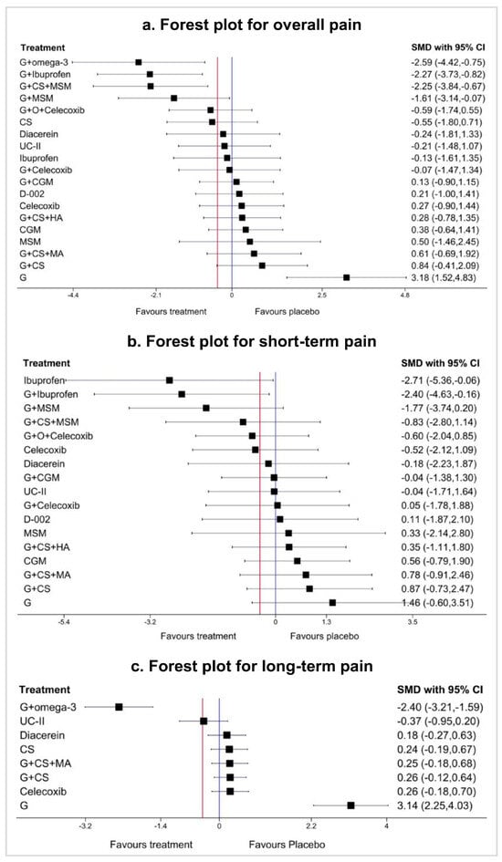 Forest plots of network meta-analysis for overall pain (a), short-term pain (b), and long-term pain (c) compared with placebo, ordered according to treatment effect size. The purple vertical line represents the line of no effect, the red vertical line indicates the MCID, and the black square represents the effect size. When the 95% CI crosses the MCID line, it indicates that the effectiveness of the intervention is uncertain. MCID, minimum clinically important difference; SMD, standardized mean difference; 95% CI, 95% confidence interval; G + omega-3, glucosamine + omega-3; G + Ibuprofen, glucosamine + ibuprofen; G + CS + MSM, glucosamine + chondroitin sulfate + methylsulfonylmethane; G + MSM, glucosamine + methylsulfonylmethane; G + O + Celecoxib, glucosamine + ozone + celecoxib; CS, chondroitin sulfate; UC-II, undenatured type II collagen; G + Celecoxib, glucosamine + celecoxib; D-002, an inhibitor of both cyclooxygenase and 5-lipoxygenase activitiy; G + CS + HA, glucosamine + chondroitin sulfate + hyaluronic acid; CGM, curcumin derivatives; MSM, methylsulfonylmethane; G + CS + MA, glucosamine + chondroitin sulfate + manganese ascorbate; G + CS; glucosamine + chondroitin sulfate; G, glucosamine.