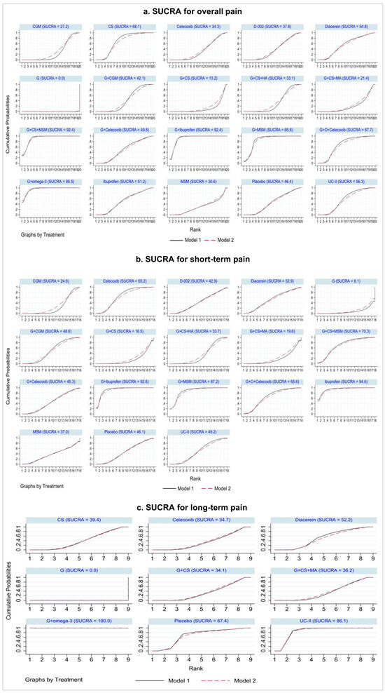 Rankograms of treatments for overall pain (a), short-term pain (b), and long-term pain (c) included in the network meta-analysis. G + omega-3, glucosamine + omega-3; G + Ibuprofen, glucosamine + ibuprofen; G + CS + MSM, glucosamine + chondroitin sulfate + methylsulfonylmethane; G + MSM, glucosamine + methylsulfonylmethane; G + O + Celecoxib, glucosamine + ozone + celecoxib; CS, chondroitin sulfate; UC-II, undenatured type II collagen; G + Celecoxib, glucosamine + celecoxib; D-002, an inhibitor of both cyclooxygenase and 5-lipoxygenase activity; G + CS + HA, glucosamine + chondroitin sulfate + hyaluronic acid; CGM, curcumin derivatives; MSM, methylsulfonylmethane; G + CS + MA, glucosamine + chondroitin sulfate + manganese ascorbate; G + CS; glucosamine + chondroitin sulfate; G, glucosamine.