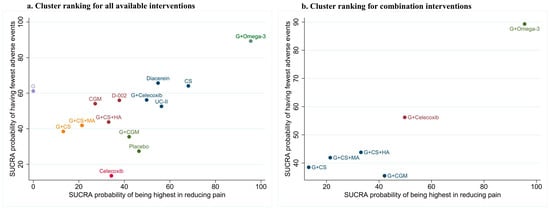 Using a cluster analysis of SUCRA values for reducing overall pain and adverse events, we generated two clustered ranking plots: one that includes all available treatments (Figure 5a) and one specifically on glucosamine combination interventions (Figure 5b). G + omega-3 interventions were found to be more effective in reducing overall pain and adverse events compared to other interventions.