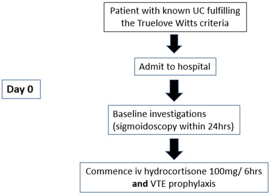 Patients with ASUC should be admitted to the hospital under the care of a gastroenterology team, working collaboratively with a multidisciplinary team that includes colorectal surgeons, gastroenterology nurses, dietitians, pharmacists, and stoma therapists [1,35]. In addition to drug therapy, key aspects of care include thromboprophylaxis, nutritional support, thorough assessment of fluid status, and correction of electrolyte imbalances.