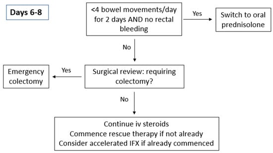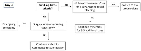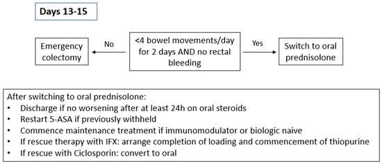 For patients responding to IV corticosteroid therapy (Figure 3), treatment can be extended for an additional 3 to 5 days or transitioned to oral prednisolone at 40 mg/day, with a planned tapering of 5 mg per week. A treatment strategy involving the initiation of steroid-sparing agents should be implemented during hospitalisation or shortly after discharge. Patients who do not respond adequately to corticosteroids should be evaluated for second-line medical therapies or surgical intervention. Timely decision-making is critical as delays in administering medical rescue therapy are associated with prolonged hospital admissions and delays in emergency colectomies lead to an increased risk of post-operative complications [23,24].