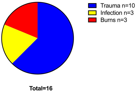 Trauma was the leading cause of soft tissue defects (10/16; 63%), followed by infection (3/16; 19%) and burn injury (3/16; 19%). Figure 1 shows an overview of the indications indicating free flap reconstruction.
