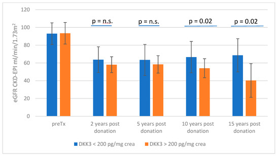 eGFR comparison of living kidney donors with DKK3 values < and ≥ 200 pg/mg crea before and after donation. N.s. = not significant.