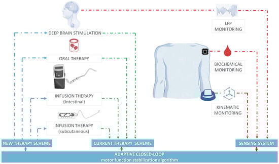 - Di Biase, L.; Tinkhauser, G.; Martin Moraud, E.; Caminiti, M.L.; Pecoraro, P.M.; Di Lazzaro, V. Adaptive, personalized closed-loop therapy for Parkinson’s disease: Biochemical, neurophysiological, and wearable sensing systems. Expert Rev. Neurother. 2021, 21, 1371–1388. [Google Scholar] [CrossRef]
