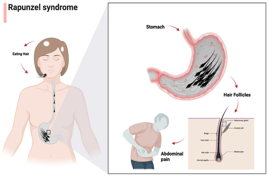 Rapunzel syndrome is a rare medical condition characterized by the presence of a trichobezoar, a mass of ingested hair that accumulates in the stomach and can extend into the small intestine [1,2,3,4,5,6,7,8,9,10,11,12,13,14]. The name comes from the fairy tale of Rapunzel, referring to the “tail” of the trichobezoar resembling her long hair.