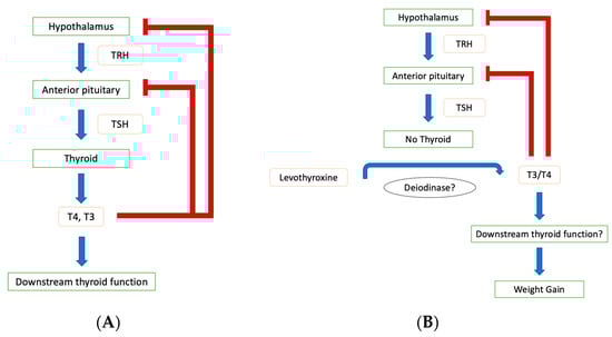 (A) Hypothalamus–pituitary–thyroid (HPT) axis. TRH: thyroid-released hormone secreted by hypothalamus. TSH: thyroid-secreted hormone secreted by anterior pituitary. Arrows indicate increased secretion. Red lines indicate negative feedback. (B) HPT axis depicted after thyroidectomy. This figure highlights potential factors that could cause potential weight gain. Levothyroxine acts as T4 hormone replacement and is converted to T3. Deiodinase and downstream thyroid functions remain unclear on how it can affect T3/T4 ratio and could serve as influence(s) for weight gain.