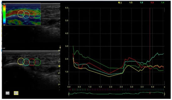 The stiffness color scheme was red (hard), green (medium), and blue (soft). The color histogram was analyzed, and subsequently, the mean intensity of each color component of the pixels within a standardized area was computed. As indicated by the manufacturer guidelines, the exact raw strain value was calculated from a 5 mm circle in a supple region of the selected area [