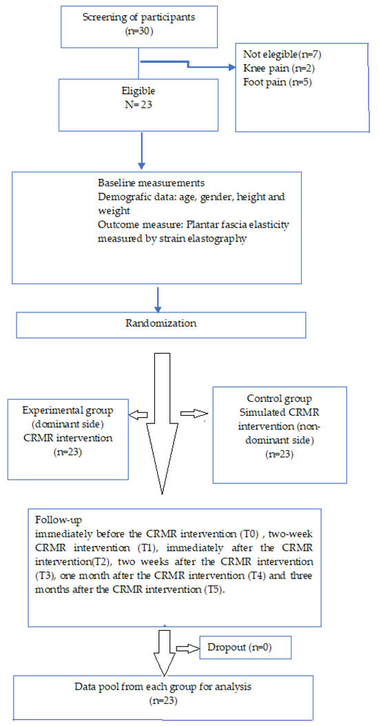 A total of 23 healthy participants were recruited. To assess all participants, quantitative SEL was used immediately prior to the CRMR intervention (T0), during the two-week CRMR intervention (T1), at the end of the CRMR intervention program (T2), two weeks after the CRMR intervention program (T3), one month after the CRMR intervention program (T4), and three months after the CRMR intervention program (T5). The study reached its goal and ended after the comparisons had been analyzed between pre-intervention and post-intervention groups and after the recruitment of the necessary sample size.