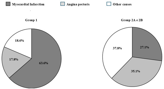 Group 2 (2A n = 18, 2B n = 19 patients): 10 experienced a myocardial infarction; 13 had angina pectoris; and 14 presented and increase in cardiac serum markers during an acute event, such as heart failure, atrial fibrillation, acute infection, valvular diseases, and chronic coronary syndrome; or patients who underwent coronary revascularization to control a known coronary artery disease.