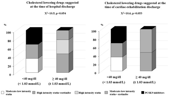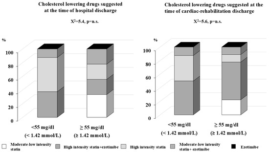 Lipid-lowering drugs suggested at the time of hospital discharge on the left panel and at the time of discharge form cardiac rehabilitation (right panel) among group 1 patients (n = 118); patients admitted to hospital for their first cardiovascular event, divided into two subgroups: those who reached and those who did not reach the LDL target < 55 mg/dL (1.42 mmol/L).
