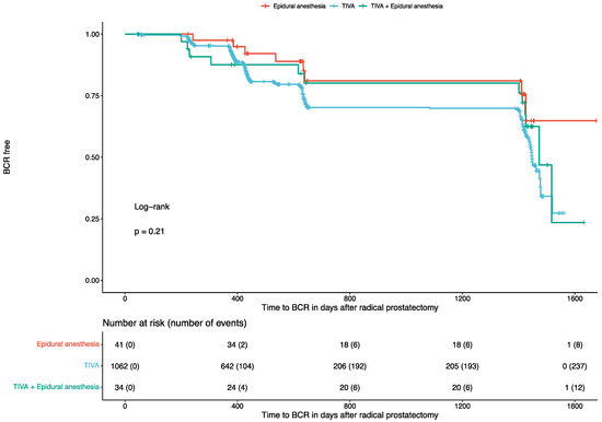After a median follow-up of 431 days (IQR: 381-639) from RP, 257 (24%) patients developed a BCR. Of them, 237 (22%) were reported in patients undergoing TIVA, 12 (35%) in patients receiving TIVA and epidural anesthesia, and 8 (20%) in patients receiving only epidural anesthesia. In the univariate Cox regression analysis with respect to the time to BCR, TIVA was not associated with better outcomes (HR: 0.81, 95% CI: 0.45 to 1.46, p = 0.5) compared to combined TIVA and epidural anesthesia. Similarly, TIVA was not associated with better outcomes (HR: 0.55, 95% CI: 0.27 to 1.12, p = 0.1) compared to solely epidural anesthesia. The corresponding Kaplan–Meier curve (log-rank test: p = 0.21) is displayed in Figure 1. Accordingly, patients who received higher intraoperative doses of remifentanil (p = 0.9), sufentanil (p = 0.3), or MME (p = 0.4) also presented similar BCR rates. The results of the univariate Cox regression analysis for the time-to-BCR are available in Table 2.