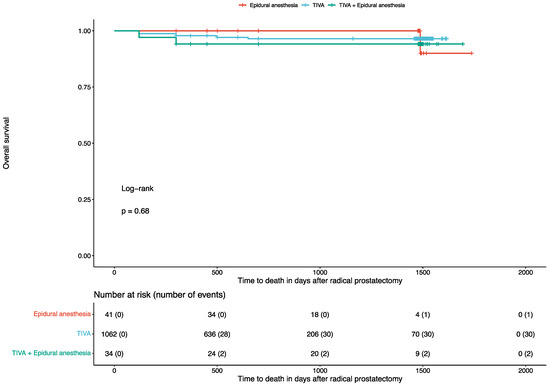 After a median follow-up of 500 days (IQR: 450–750) from RP, 33 (2.9%) patients died. Of these, 30 (2.8%) were reported to be patients undergoing TIVA, 2 (5.9%) to be patients receiving TIVA and epidural anesthesia, and 1 (2.4%) to be a patient receiving only epidural anesthesia. In the univariate Cox regression analysis with respect to the time to death, TIVA was not associated with better outcomes (HR: 1.82, 95% CI: 0.43 to 7.66, p = 0.4) compared to combined TIVA and epidural anesthesia. Similarly, TIVA was not associated with better outcomes (HR: 0.75, 95% CI: 0.1 to 5.51, p = 0.8) compared to solely epidural anesthesia. The corresponding Kaplan–Meier curve (log-rank test: p = 0.68) is displayed in Figure 2. Accordingly, patients who received higher intraoperative doses of remifentanil (p = 0.8), sufentanil (p = 0.8), or MME (p = 0.4) also presented similar survival rates. The results of the univariate Cox regression analysis for the time-to-death are available in Table 2.