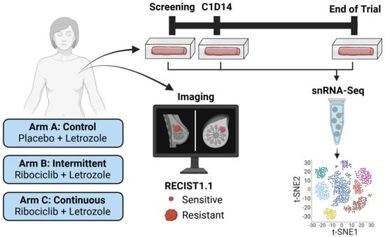 FELINE trial design. Early-stage ER+ breast cancer patients are stratified into one of three arms to receive letrozole alone, or combination therapy with ribociclib. Imaging of the tumor is obtained to classify patient response as sensitive or resistant based on RECIST criteria. Three core biopsies are obtained over the course of 6 months at screening, C1D14, and end of trial for snRNA-Seq. Created in https://BioRender.com/g23h600 (accessed on 9 December 2024).