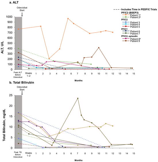 Odevixibat is an inhibitor of the ileal bile acid transporter (IBAT) that blocks the reabsorption of bile acids in the distal ileum and increases their excretion in the colon []. Odevixibat is indicated for the treatment of PFIC in the European Union and for pruritus in PFIC in the United States; in addition, odevixibat is indicated for the treatment of cholestatic pruritus in Alagille syndrome in the European Union and the United States [,,]. Results from the phase 3 PEDFIC 1 and PEDFIC 2 studies of odevixibat in patients with PFIC have demonstrated that treatment with odevixibat improved pruritus and reduced serum bile acid levels (co-primary endpoints); improvements in liver function tests, sleep parameters, and growth were also observed [,]. Data on real-world efficacy and safety of odevixibat in patients with PFIC are currently limited.
