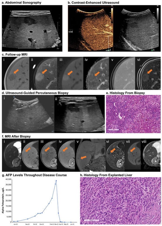 Patients 1 and 2 (siblings) underwent liver transplantation: patient 1 underwent liver transplantation due to HCC manifestation, and patient 2 due to severe failure to thrive and refractory severe pruritus. Patient 1 was screened for suspected HCC due to focal liver lesions detected in an abdominal sonography conducted as part of standard follow-up (Figure 3a). Contrast-enhanced ultrasound (Figure 3b) and magnetic resonance imaging (MRI) (Figure 3c) of the liver were performed and showed enhancement of the largest lesion (segment 7, maximum diameter: 1.5 cm). An ultrasound-guided percutaneous biopsy was performed (Figure 3d), and histopathology showed cholestatic hepatitis with giant cell formation and single cell and group necrosis and fibrosis compatible with a diagnosis of advanced cholestatic infantile liver disease. No evidence of malignancy was found. A second, follow-up MRI using a hepatospecific contrast agent confirmed the initial findings (i.e., enhancement of the lesion without wash-out; Figure 3c(vi)). Due to the MRI results and the patient’s increasing alpha fetoprotein (AFP) levels (Figure 3g), an open surgical biopsy was recommended for histological confirmation of the findings. Histopathology again showed cholestatic liver parenchyma with advanced fibrosis and no malignancy (Figure 3e). Five months after the biopsy, MRI showed a new 10 mm lesion contiguous to the scar zone of the biopsy (Figure 3f). The patient underwent liver transplantation, and HCC was confirmed via histology from the explanted liver (Figure 3h).